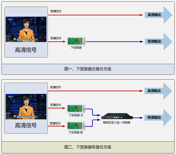 上圖中,標(biāo)清信號(hào)是通過高清信號(hào)下變換得到的,圖中只配置了一個(gè)下變換器。有人說,下變換壞了也掉電直通不就行了嗎?或者用跳線盤短接不就行了嗎?顯然不行。